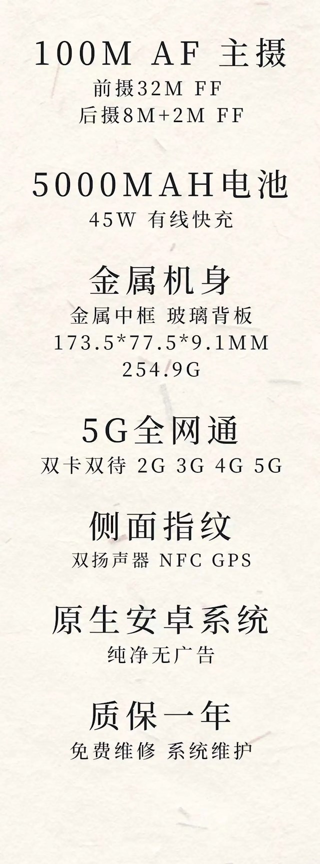 支持侧边指纹、5G全网通、双卡双待,预装原生安卓系统,纯净无广告,质保一年。