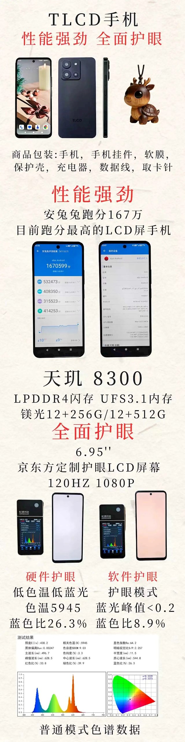 规格方面,TLCD手机配备6.95英寸京东方LCD屏,支持120Hz刷新率与1080P分辨率,满足LCD屏爱好者的护眼需求。