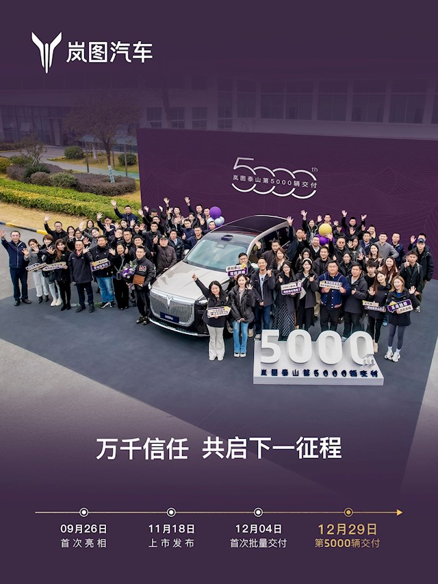 快科技12月29日消息,岚图汽车今晚官宣,仅用时26天,品牌旗舰SUV岚图泰山交付达成5000辆!